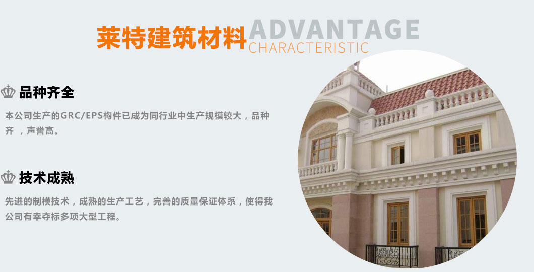 EPS/GRC產品是目前主導外墻裝飾的新型綠  色 環 保材料。較預制模板繁瑣的施工程序和高額的施工成本,更適用于安裝于外墻EPS,XPS保溫的墻體上。即能體現歐式、古典、高雅的裝飾風格,又能保 證主體建筑外墻不出現冷、熱橋效應。
